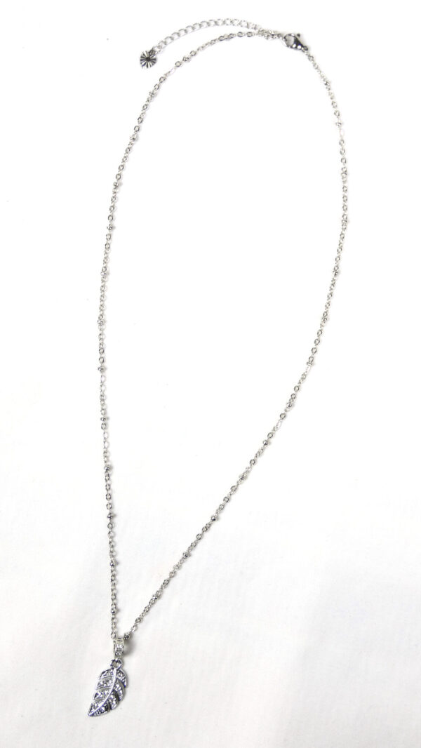 Het geheel is afgewerkt met een, eveneens verzilverd en van een rhodiumlaagje voorzien, hangertje in de vorm van een blad.