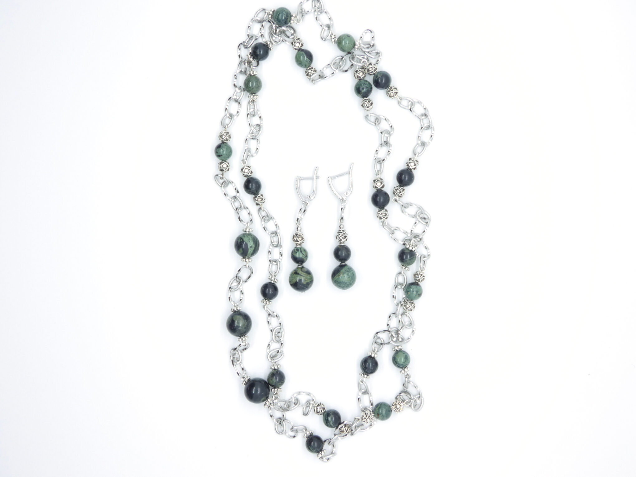 Extra lange halsketting van rhodium plated metaal met twee maten groene ogen jaspis Edelstenen